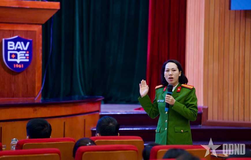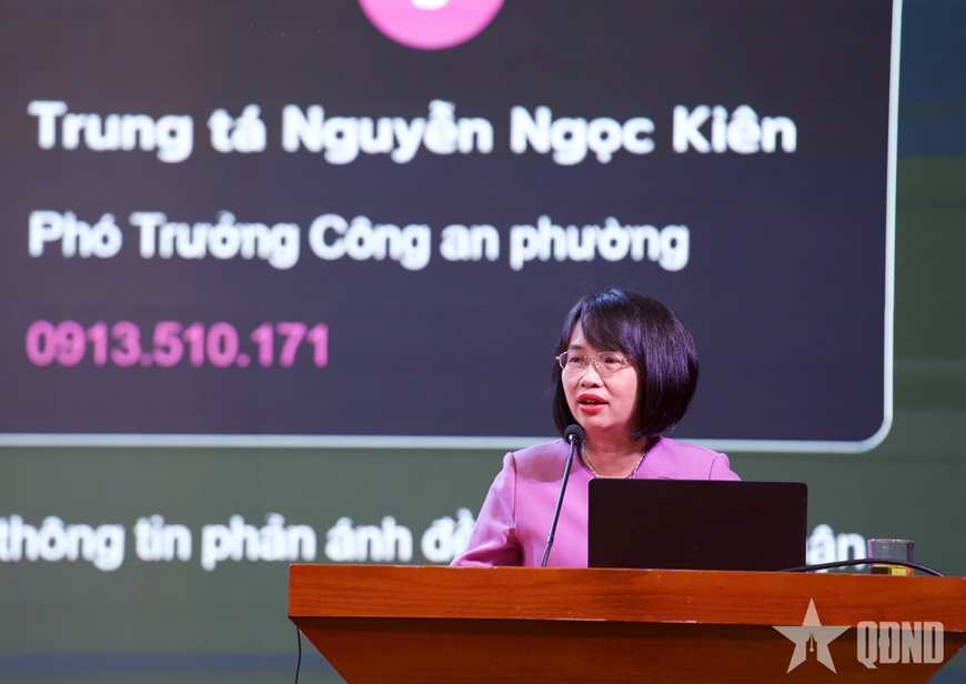 | Thiếu tá Đỗ Thị Huyền Trang, cán bộ Công an phường Kim Liên, báo cáo viên trình bày nội dung lừa đảo trên không gian mạng và bắt cóc online |