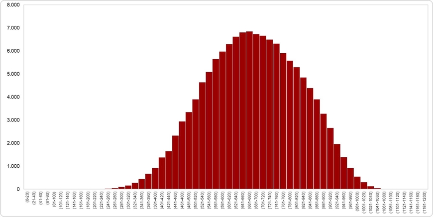 Kết quả đợt 1 kỳ thi V-ACT năm 2026 cho thấy phổ điểm có dạng gần phân bố chuẩn với điểm trung bình và trung vị, đều bằng 682 điểm. Phổ điểm trải rộng với độ lệch chuẩn bằng 141,2 thể hiện khả năng phân loại thí sinh tốt. Khoảng 30% thí sinh đạt dưới 600 điểm, 55% dưới 700 điểm và chỉ khoảng 6% đạt từ 900 điểm trở lên, cho thấy sự phân tầng rõ rệt giữa các nhóm năng lực.