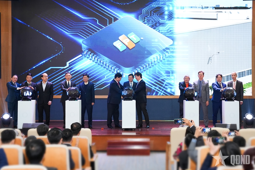 | Các đại biểu thực hiện nghi thức thành lập Nhà máy Kiểm thử và Đóng gói tiên tiến chip bán dẫn. |
