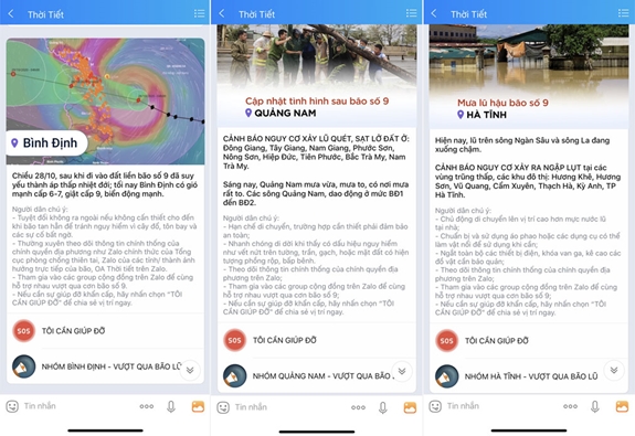 Bên cạnh đó, Tổng cục Phòng, chống thiên tai (Bộ Nông nghiệp và Phát triển nông thôn) đã thông qua trang Zalo chính thức “Phòng, chống thiên tai” để cập nhật nhanh tình hình thời tiết, mưa lũ, cảnh báo khẩn cấp, trang bị kiến thức cho người dân để chủ động ứng phó, đảm bảo an toàn tính mạng, tài sản. Mỗi thông tin, bài viết đều được trang Zalo “Phòng, chống thiên tai” gửi đến gần 10 triệu người dùng và nhận được hàng triệu lượt xem. Đã có hơn 24 triệu lượt tin nhắn gửi đi từ các trang Zalo chính thức của địa phương như: Trang Zalo “Tổng đài 1022 Đà Nẵng”, trang Zalo “Trung tâm HueIOC”…