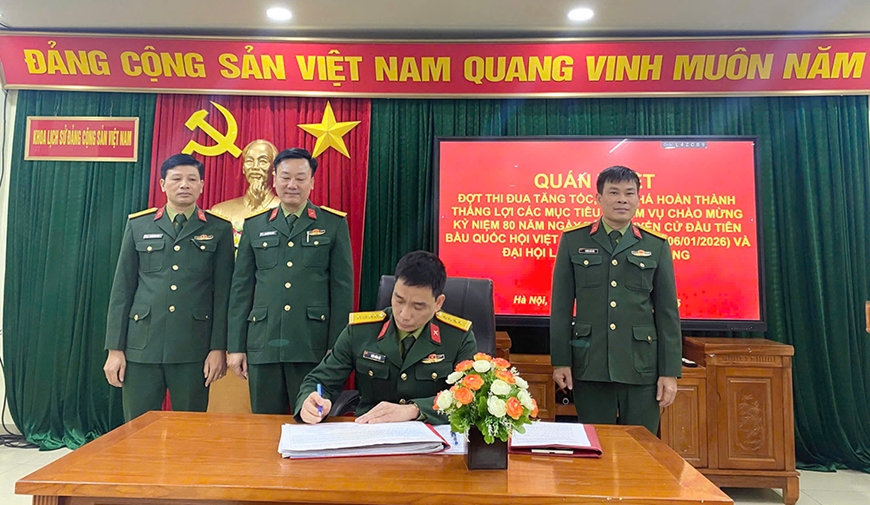 Thi đua tăng tốc, bứt phá hoàn thành nhiệm vụ chính trị, đẩy mạnh thực hiện có hiệu quả Nghị quyết số 71-NQ/TW của Bộ Chính trị về đột phá phát triển giáo dục, đào tạo; Nghị quyết số 1657-NQ/QUTW của Quân ủy Trung ương về đổi mới công tác giáo dục và đào tạo đáp ứng yêu cầu, nhiệm vụ xây dựng Quân đội thời kỳ mới; Nghị quyết lãnh đạo thực hiện nhiệm vụ năm học của Đảng ủy Học viện, Chi bộ và phương châm “Chất lượng đào tạo của nhà trường là khả năng sẵn sàng chiến đấu của đơn vị”. Phấn đấu 90% trở lên bài giảng đạt khá và tốt, có hơn 45% tốt; 100% cán bộ, giảng viên, nhân viên chấp hành nghiêm quy chế, quy định. Tổ chức sơ kết học kỳ 1 năm học 2025 - 2026 đúng kế hoạch. Có nhiều bài giảng ứng dụng công nghệ AI đạt chất lượng tốt, hiệu quả, thiết thực.