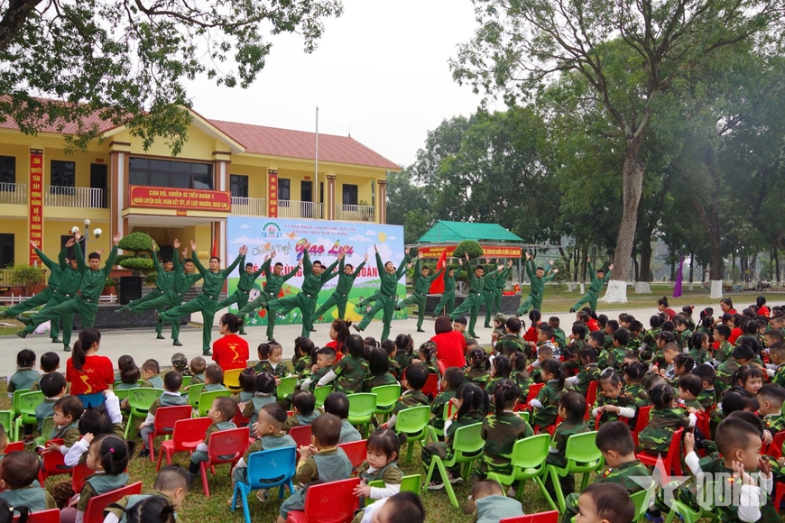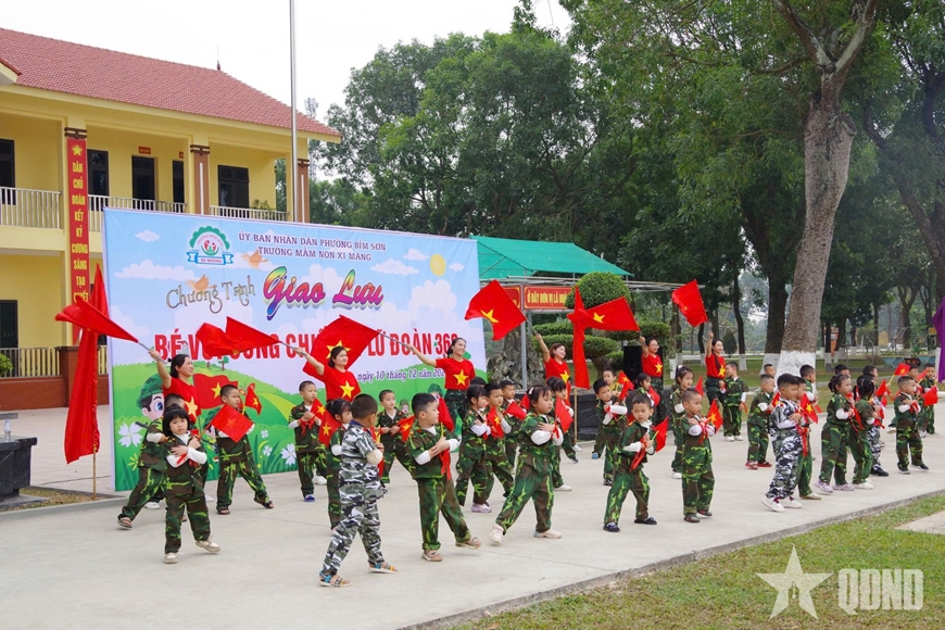 Cán bộ, giáo viên và gần 300 học sinh Trường Mầm non Xi măng (phường Bỉm Sơn, tỉnh Thanh Hóa) ngày 10-12 đã có những giờ phút hào hứng khám phá những hình ảnh, hiện vật trưng bày trong nhà truyền thống, doanh trại; giao lưu với cán bộ, chiến sĩ Lữ đoàn 368 (Quân đoàn 12).