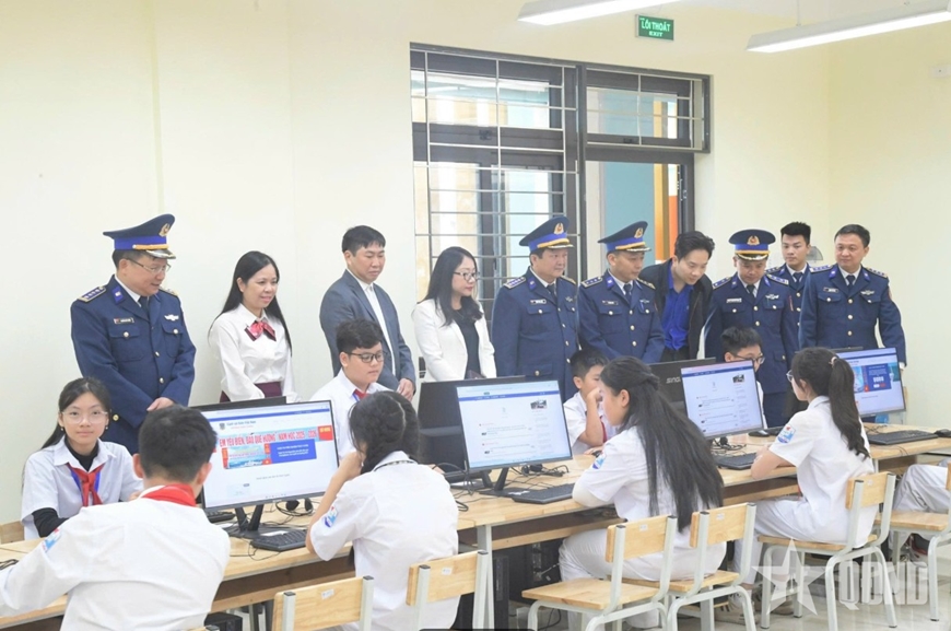 | Các đại biểu theo dõi học sinh Trường THCS Trọng Điểm tham gia Cuộc thi trực tuyến "Em yêu biển, đảo quê hương". |