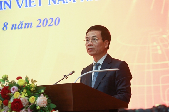 Bộ trưởng Bộ Thông tin và Truyền thông Nguyễn Mạnh Hùng phát biểu tại buổi họp báo. |