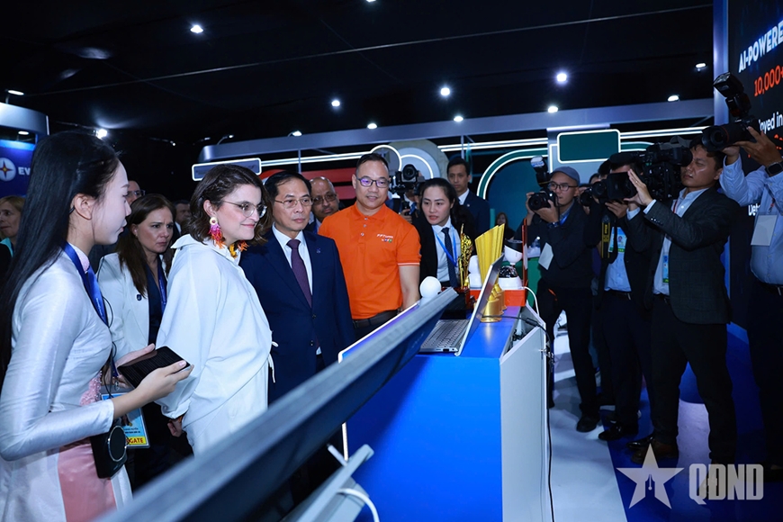 | Tại sự kiện, đại diện FPT giới thiệu với Phó thủ tướng Chính phủ Bùi Thanh Sơn và Phó tổng thống Ecuador María José Pinto González Artigas (áo trắng) cùng đoàn đại biểu về nền tảng giám sát bảo mật thông minh bằng AI của FPT đang được triển khai hiệu quả trong một số dự án an ninh quốc gia. |