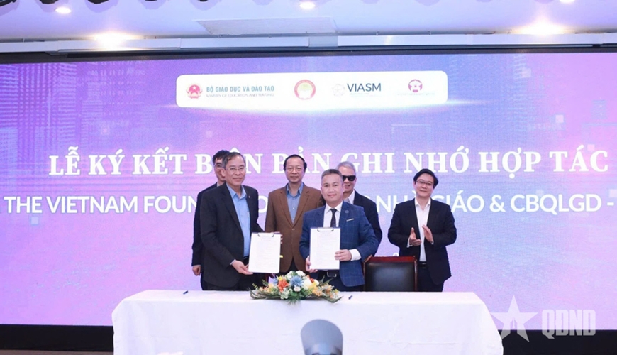 | Lãnh đạo của Cục Nhà giáo và Cán bộ Quản lý Giáo dục và tổ chức The Vietnam Foundation ký kết biên bản ghi nhớ hợp tác. |