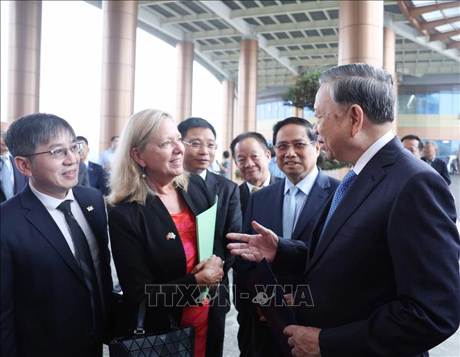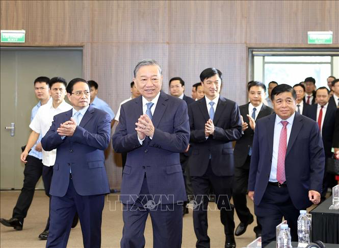 Tổng Bí thư Tô Lâm, Thủ tướng Phạm Minh Chính và các đại biểu dự Lễ hưởng ứng Ngày hội đổi mới sáng tạo Quốc gia năm 2025. |