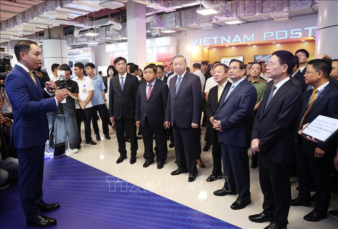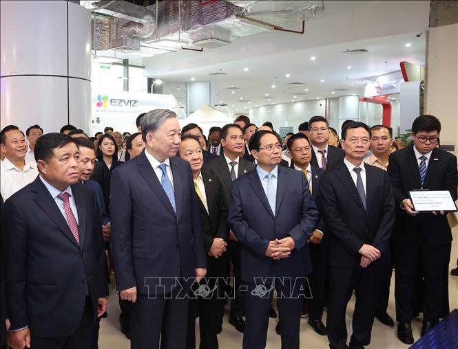 Tổng Bí thư Tô Lâm, Thủ tướng Phạm Minh Chính và các đại biểu tham quan các gian trưng bày sản phẩm công nghệ tại triển lãm.