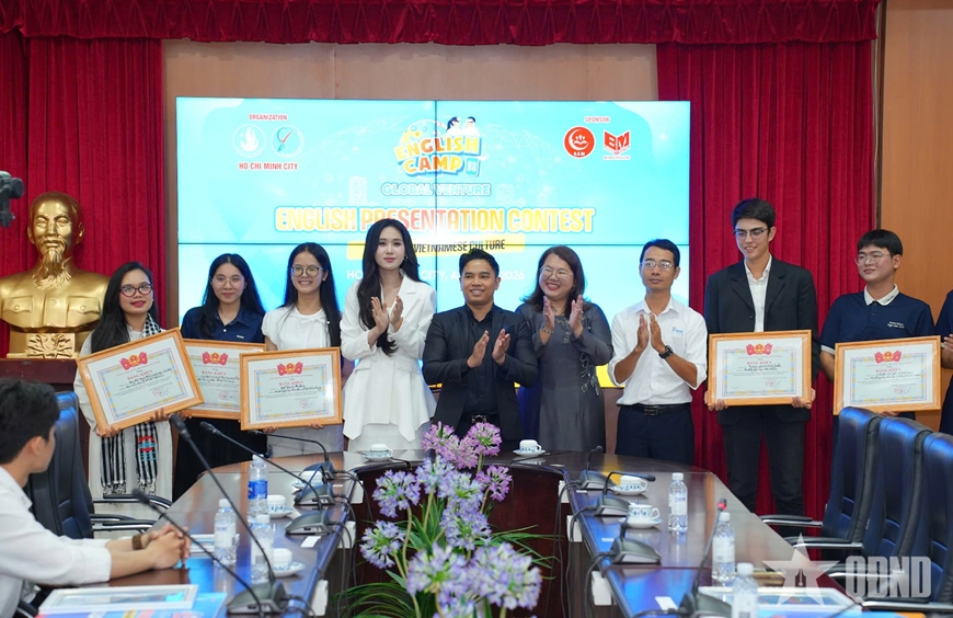 | Ban tổ chức trao thưởng cho các thí sinh tiêu biểu trong cuộc thi thuyết trình bằng tiếng Anh. |
