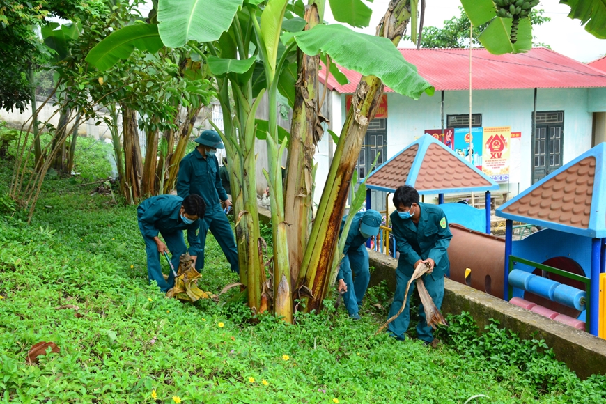 | Lực lượng dân quân xã Thanh Minh giúp nhà trường dọn dẹp khuôn viên. |