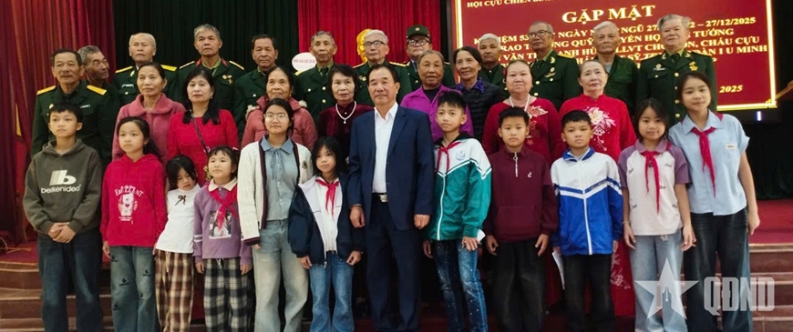| Thượng tướng Mai Quang Phấn và gia đình các cựu chiến binh chụp ảnh lưu niệm cùng các cháu học sinh. |