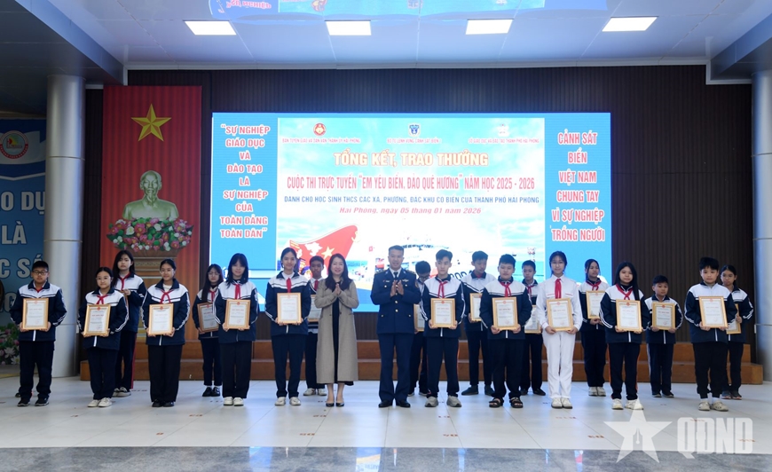 Ngày 5-1, Bộ tư lệnh Vùng Cảnh sát biển 1 phối hợp với Ban Tuyên giáo và Dân vận Thành ủy Hải Phòng; Sở Giáo dục và Đào tạo TP Hải Phòng tổ chức trao thưởng cho các em học sinh đạt kết quả cao trong cuộc thi trực tuyến “Em yêu biển, đảo quê hương” năm học 2025-2026 dành cho học sinh của 60 trường THCS trên địa bàn 15 xã, phường, đặc khu có biển trên địa bàn thành phố.