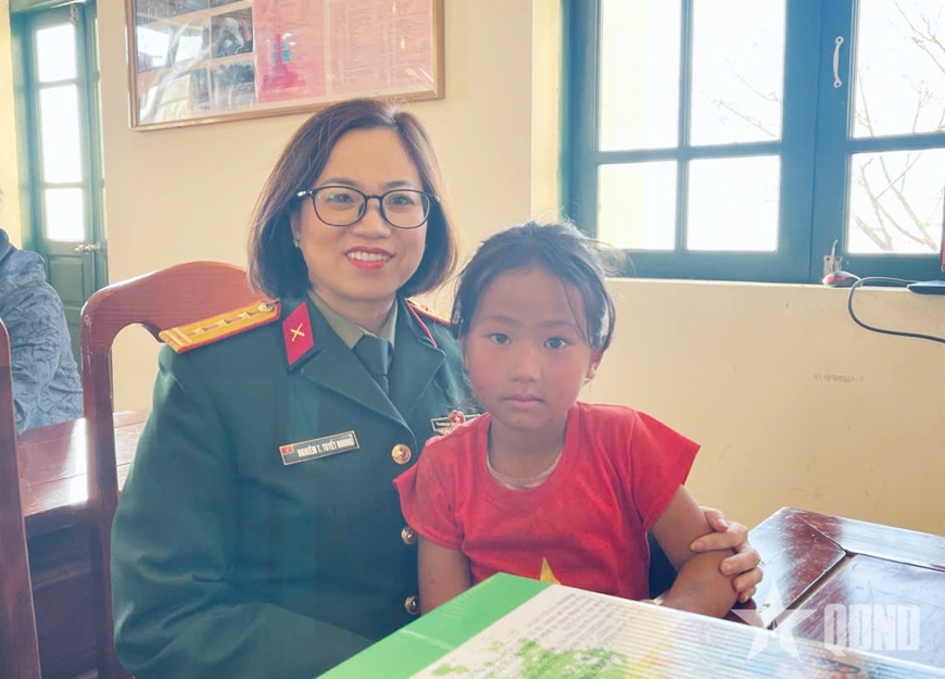 | Cán bộ, nhân viên Trung tâm 586 với thiếu nhi xã Sin Suối Hồ. |