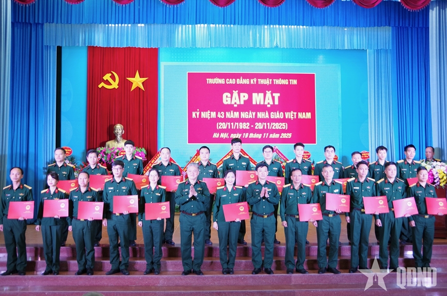 Tại buổi gặp mặt, thừa ủy quyền của cấp trên, thủ trưởng Binh chủng và nhà trường trao chứng nhận chức danh giảng viên cao cấp cho 1 đồng chí, giảng viên chính 11 đồng chí, giảng viên giỏi cấp cơ sở năm học 2024-2025 cho 25 đồng chí; trao thưởng 5 đồng chí có thành tích xuất sắc trong tham gia Hội thi giảng viên, giáo viên các trường cao đẳng, trung cấp trong Quân đội năm 2025; trao thưởng 9 tập thể và 11 cá nhân có thành tích xuất sắc trong thực hiện “Tháng hành động cao điểm chào mừng kỷ niệm 43 năm Ngày Nhà giáo Việt Nam”.