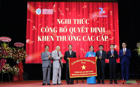 Nhà trường đón nhận bức trướng do UBND tỉnh Bình Dương trao tặng. |