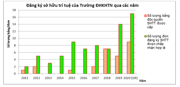 Chỉ tính 10 tháng đầu năm 2020, Trường ĐH Khoa học tự nhiên (ĐHKHTN) đã được Cục Sở hữu Trí tuệ Việt Nam cấp 4 bằng độc quyền sáng chế, 5 bằng độc quyền giải pháp hữu ích và chấp nhận hợp lệ 17 đơn đăng ký Sở hữu trí tuệ (SHTT). Đây là kết quả tốt nhất từ trước đến nay của trường về số lượng bằng độc quyền được cấp và số đơn đăng ký SHTT được chấp nhận hợp lệ.