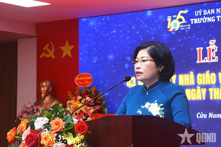 | Nhà giáo Phạm Thu Hà, Bí thư Đảng ủy, Hiệu trưởng Trường THCS Ngô Sĩ Liên đọc diễn văn tại lễ kỷ niệm. |
