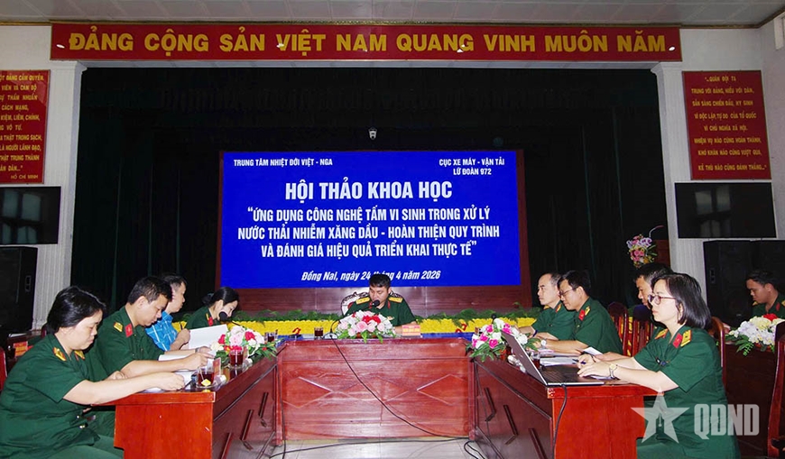 Tại hội thảo, các đại biểu nghe nhiều báo cáo khoa học tập trung làm rõ kết quả nghiên cứu, hoàn thiện quy trình công nghệ và hiệu quả vận hành thực tế của hệ thống xử lý nước thải nhiễm xăng, dầu ứng dụng công nghệ tấm vi sinh; phân tích tần suất, hiệu quả xử lý nước thải nhiễm xăng, dầu, độ bền và tính ổn định của vật liệu vi sinh, cũng như khả năng nhân rộng mô hình tại các đơn vị kỹ thuật trong toàn quân...