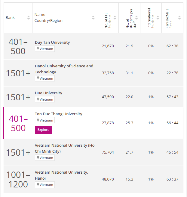 Cụ thể, Trường Đại học Duy Tân và Trường Đại học Tôn Đức Thắng trong nhóm 401-500; Đại học Quốc gia Hà Nội trong nhóm 1001-1200; Trường Đại học Bách khoa Hà Nội, Đại học Huế và Đại học Quốc gia Thành phố Hồ Chí Minh trong nhóm 1501+.