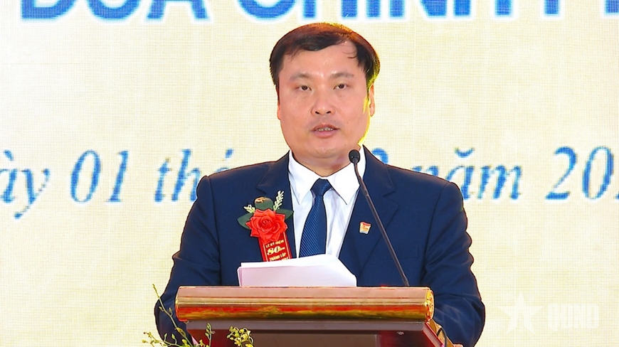 | Đồng chí Triệu Trung Kiên, Bí thư Đảng ủy, Hiệu trưởng Trường THPT Hùng Vương trình bày diễn văn. |