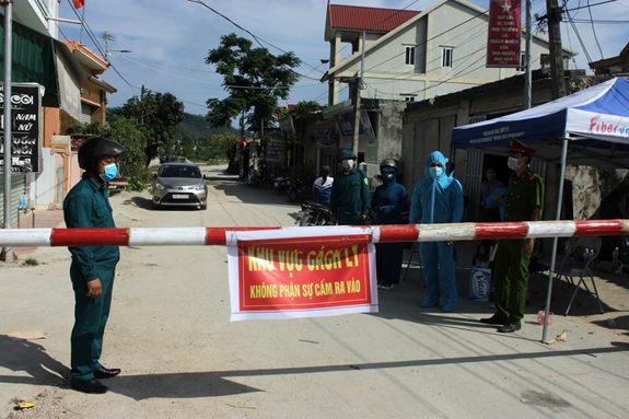 Các đảng viên, dân quân xã Quỳnh Lập, thị xã Hoàng Mai tham gia kiểm soát tình hình khu vực cách ly phòng, chống dịch Covid-19. |