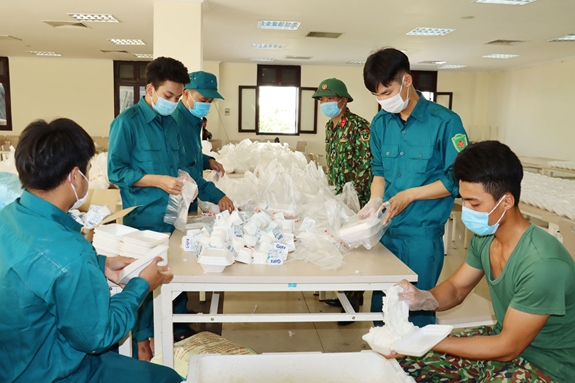 Lực lượng dân quân huyện Phú Vang, Thừa Thiên Huế chuẩn bị cơm phục vụ bà con trong khu cách ly y tế T4. |