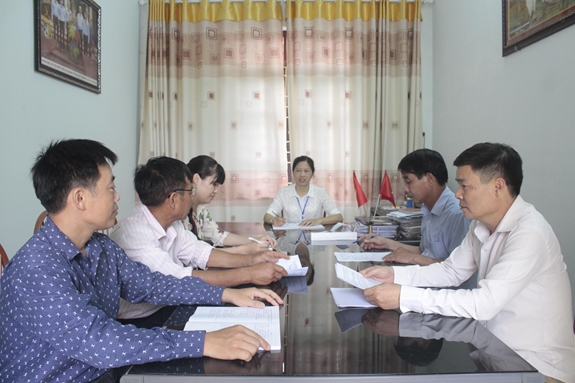 Bí thư Đảng ủy xã Cao Đại Đỗ Thị Sáng chủ trì hội nghị Ban chỉ đạo dồn thửa, đổi ruộng của xã. Ảnh: ĐÀO DUY TUẤN. |