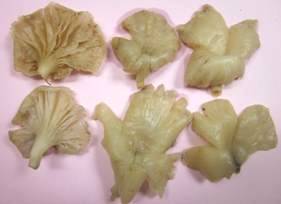 - Hình thể của nấm: là dạng thể quả; mũ nấm hình quạt hoặc hình phễu, màu trắng hoặc màu kem hoặc xám hoặc hơi vàng (phụ thuộc vào nấm mọc trên loài cây gỗ mục nào), giữa mũ nấm thường có màu đậm hơn, khi già mép mũ nấm thường cuốn xuống, đường kính mũ 2–10cm (tùy theo nấm non hay trưởng thành và tùy theo chất dinh dưỡng trong gỗ mục); phiến nấm màu trắng đến hơi vàng, hơi xám; cuống nấm thường đính lệch vào mũ, dài 2 – 4cm; thịt nấm màu trắng.
