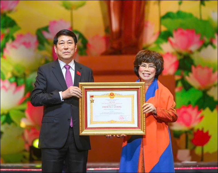 Anh hùng Lao động Thái Hương thay mặt tập thể Tập đoàn TH vinh dự đón nhận danh hiệu Anh hùng Lao động do Chủ tịch nước Lương Cường trao tặng.