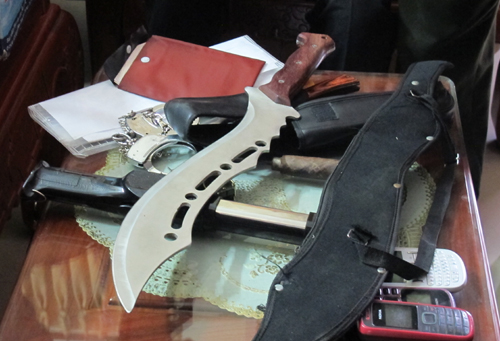 Trong quá trình khám xét, trên chiếc xe toyota Land Cruiser Prado biển kiểm soát 31F 6102 của bị can, lực lượng chức năng phát hiện một còng số 8, một dùi cui điện, một dao dài 58cm (cả cán) một dao bấm và một dao nhọn.