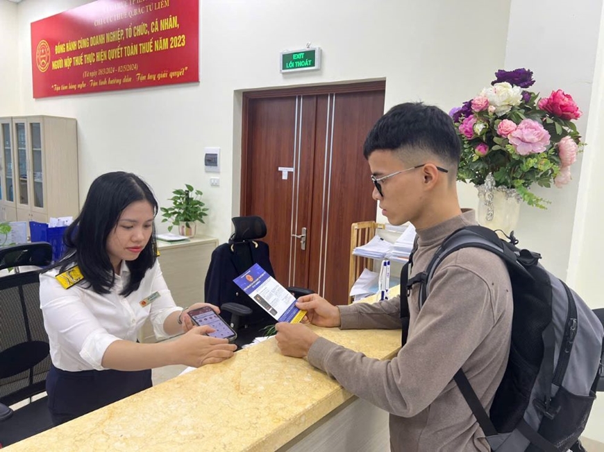 Cán bộ thuế cơ sở 9 TP Hà Nội hướng dẫn người nộp thuế sử dụng ứng dụng eTax Mobile. Ảnh: VIỆT ANH