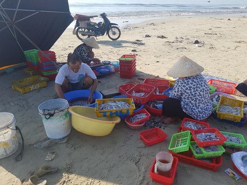 Sơ chế hải sản sau khai thác tại một bãi biển ở TP Nha Trang (Khánh Hòa). |