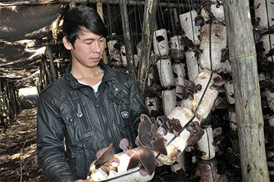 Anh Nguyễn Đức Tình thăm và theo dõi quá trình phát triển mộc nhĩ tại xưởng nuôi trồng.