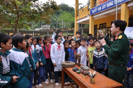 QĐND - Một buổi học thật đặc biệt vừa được Văn phòng cơ quan thường trực-Ban Chỉ đạo “Chương trình hành động quốc gia khắc phục hậu quả bom, mìn sau chiến tranh” và Cục Tuyên huấn (Tổng cục Chính trị) tổ chức dành cho giáo viên và hơn 300 học sinh tại Trường THCS xã Quốc Khánh, huyện Tràng Định, tỉnh Lạng Sơn. Đứng lớp là những cán bộ thuộc Cục Tuyên huấn và Trung tâm Công nghệ xử lý bom mìn (Binh chủng Công binh). Giáo cụ cho buổi học là các loại bom, mìn, đạn, vật liệu gây nổ...