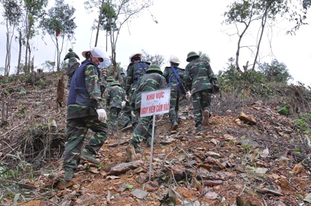 | Cùng với việc tuyên truyền, các tổ đội công tác của Trung tâm Công nghệ xử lý bom mìn còn tiến hành rà, phá bom, mìn sót lại trên địa bàn xã Quốc Khánh. |