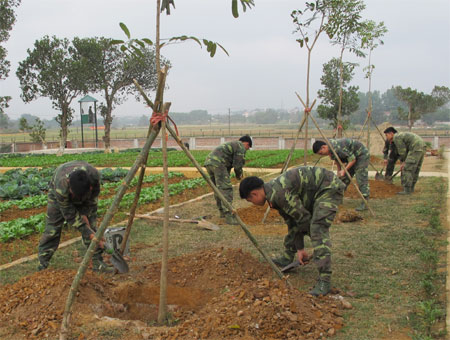 Chiến sĩ Tiểu đoàn 5, Trung đoàn 692, Sư đoàn 301 trồng cây trong khuôn viên đơn vị.
