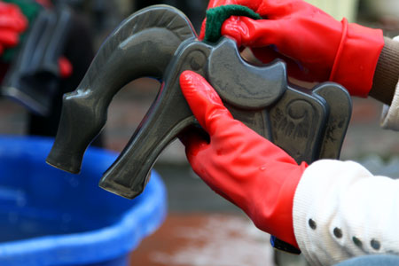 Bên một bức tường trong một con ngõ với chiều ngang chỉ đủ 2 chiếc xe đạp tránh nhau, một người đàn ông đang vỗ những nắm than đen nhánh lên tường. Bát Tràng đã sử dụng khí gas để nung sản phẩm từ lâu lắm rồi, sao vẫn còn than đắp lên tường như vậy nhỉ? Trước thắc mắc của chúng tôi, người đàn ông cho biết, than vẫn được người dân Bát Tràng dùng để sấy khuôn làm gốm. Rồi anh cười hóm hỉnh: “Để có được những sản phẩm tinh tế, bao bí quyết đã được người dân Bát Tràng tích cóp hàng trăm năm nay, và sấy khuôn cũng là một trong những bí quyết gia truyền ấy”.
