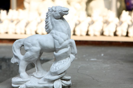 Trước gian hàng nhà ông Trần Mạnh Tuân, năm nay 69 tuổi, ở xóm 3, thôn Bát Tràng (xã Bát Tràng), có rất nhiều ngựa màu trắng phau được bày bán. Hỏi kỹ thì được biết, đó là những con ngựa được làm từ thạch cao.