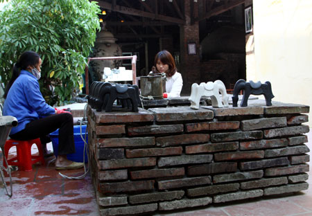 Bên chiếc giếng cổ, được xây bằng gạch Bát Tràng, 2 nữ nhân công của khu du lịch đang vệ sinh các sản phẩm trước khi bày bán. Sản phẩm mà các chị chị đang lau chùi là những con ngựa gốm.