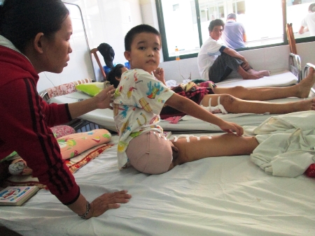 QĐND - Gia đình anh Hà Văn Đức, quê ở xã Điện Hồng, huyện Điện Bàn, tỉnh Quảng Nam là hộ nghèo, hai vợ chồng rất chăm chỉ làm thuê để nuôi hai con khôn lớn. Cuộc sống gia đình đang yên ả thì tai họa đổ xuống. Chiều ngày 7-9-2013, trong lúc đi học về bằng xe đạp, cháu Hà Danh Đạo (10 tuổi) đã bị một xe tải va vào, kẹp nát chân bên phải và chân bên trái bị gãy. Cháu Đạo phải cắt bỏ một chân tới khớp háng, chân còn lại phải bắt vít cố định để hy vọng sau này đi lại được. Mỗi lần đau quá, cháu lại gào khóc thảm thiết khiến vợ chồng anh Đức và những người bệnh khác cùng phòng bệnh rơi nước mắt.