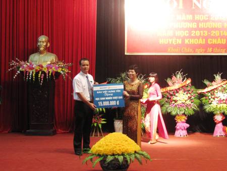 Bà Lê Thị Lương, Trưởng phòng GD&ĐT huyện Khoái Châu nhận quà ủng hộ Quỹ khuyến học của đại diện Công ty Bảo Việt Hưng Yên.