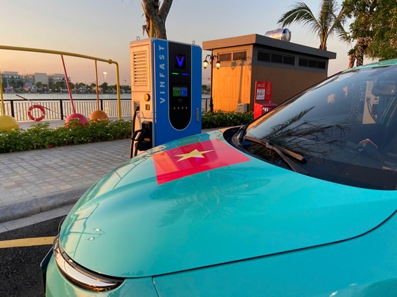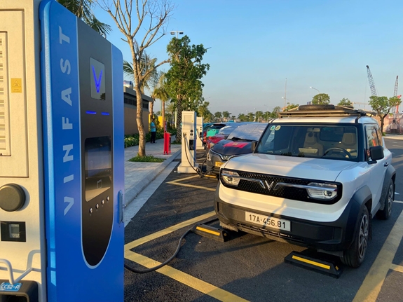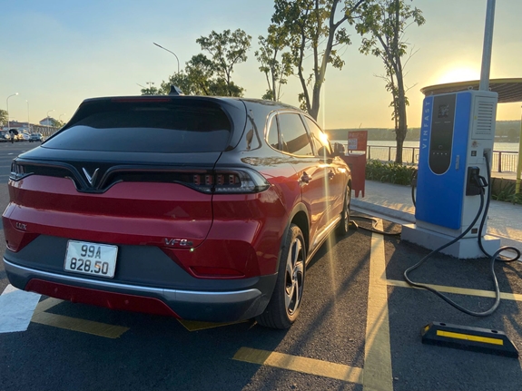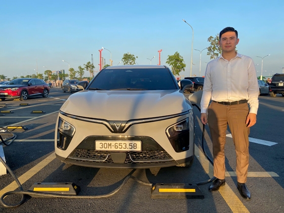 Sau khi sạc xe tại Trung tâm Triển lãm Việt Nam, chị Hoàng Thiên Kim, chủ nhân của chiếc xe điện VinFast VF 5, cũng tỏ ra rất hài lòng.