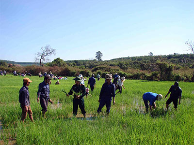 Cán bộ Công ty 72 hướng dẫn bà con dân tộc thiểu số trồng lúa nước.