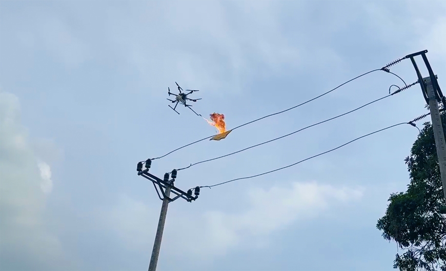 Ứng dụng UAV gắn vòi phun lửa xử lý các mối nguy đe dọa sự cố đường dây, nâng cao an toàn và hiệu quả vận hành lưới điện. Ảnh: MINH ĐỨC