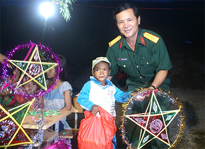 Đại tá Nguyễn Phi Thường, Phó chủ nhiệm Chính trị Bộ Chỉ huy Quân sự tỉnh Quảng Ngãi tặng đèn lồng cho trẻ em Mang Tà Bể.