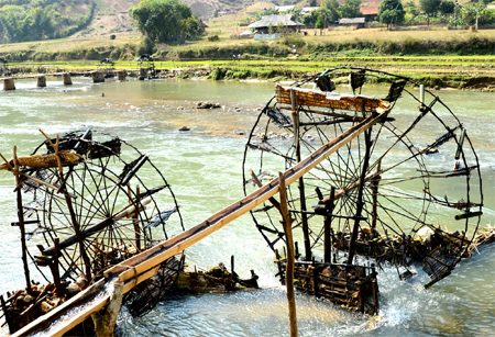 Dùng cọn nước truyền thống để tưới tiêu cho ruộng bậc thang ở huyện Tuần Giáo.