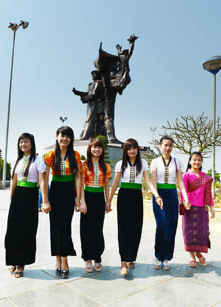 Nữ sinh Trường dân tộc nội trú huyện Điện Biên tham quan Tượng đài Chiến thắng.