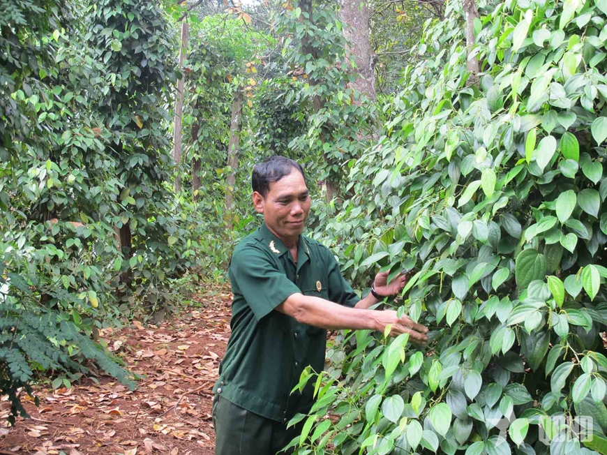 Cựu chiến binh xã Phú Nghĩa (tỉnh Đồng Nai) chăm sóc vườn hồ tiêu xanh tốt.