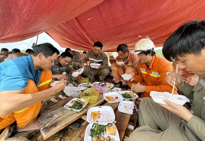 Bữa trưa tại công trường của lực lượng xung kích Truyền tải điện miền Đông 2 (Công ty Truyền tải điện 4) hỗ trợ nhà thầu. |