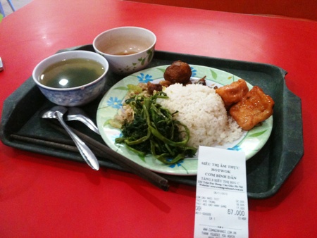 QĐND - Sau một hồi lang thang mua sắm, tôi quyết định dừng lại trước quầy có tấm biển “Cơm bình dân” và gọi món. Nhìn đĩa cơm trắng với 2 miếng đậu kho, 1 quả trứng, mấy miếng thịt lợn bèo nhèo, khoảng 1 thìa mướp đắng xào cùng lèo tèo mấy cọng rau muống với giá 67.000 đồng (xem ảnh), đã vậy lại không được "bắt mắt" nên tôi không khỏi thắc mắc. Tuy nhiên, nhân viên bán hàng thản nhiên cho biết: “Anh yên tâm, bọn em có hóa đơn đàng hoàng…”. Hết nhìn đĩa cơm, lại nhìn hóa đơn thanh toán tôi không còn hứng thú với bữa trưa nữa. Đó là những gì tôi đã ghi nhận được tại quầy “Cơm bình dân” ở tầng 3, Siêu thị Big C, số 222 Trần Duy Hưng, Cầu Giấy, Hà Nội.